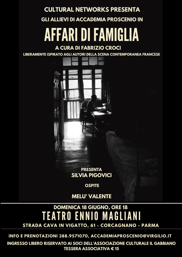 Domenica 18 giugno, alle ore 18, per festeggiare la conclusione del primo ciclo propedeutico di Accademia Proscenio, all’ interno della cornice dello show teatrale Cultural Networks, andrà in scena “Affari di famiglia”, presso il Teatro Ennio Magliani di Corcagnano.