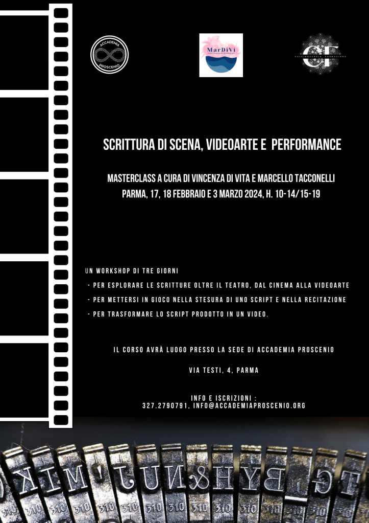 Accademia Proscenio, in collaborazione con MarDiVi, il duo artistico composto da Vincenza Di Vita e Marcello Tacconelli, presenta una masterclass unica nel suo genere, dedicata alla scrittura di scena, alla videoarte e alla performance. La masterclass si terrà a Parma, presso la sede di Accademia Proscenio, in Via Testi, 4, nelle seguenti date: