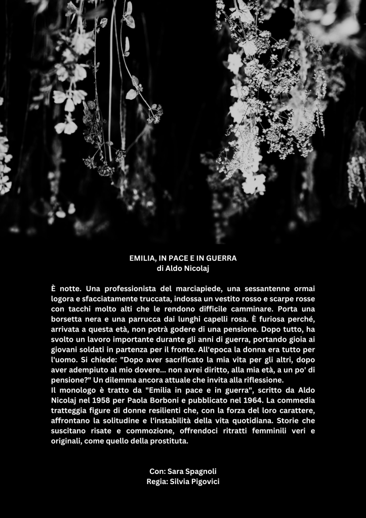 Da “Emilia, in pace e in guerra” di Aldo Nicolaj, il ritratto di una prostituta sessantenne che riflette sulla sua vita e sul suo lavoro durante la guerra, interrogandosi sul diritto a una pensione dopo anni di sacrificio. Il monologo evidenzia la resilienza delle donne e la loro lotta contro la solitudine e l’instabilità della vita. Storie che suscitano risate e commozione, offrendoci ritratti femminili veri e originali, come quello della prostituta.