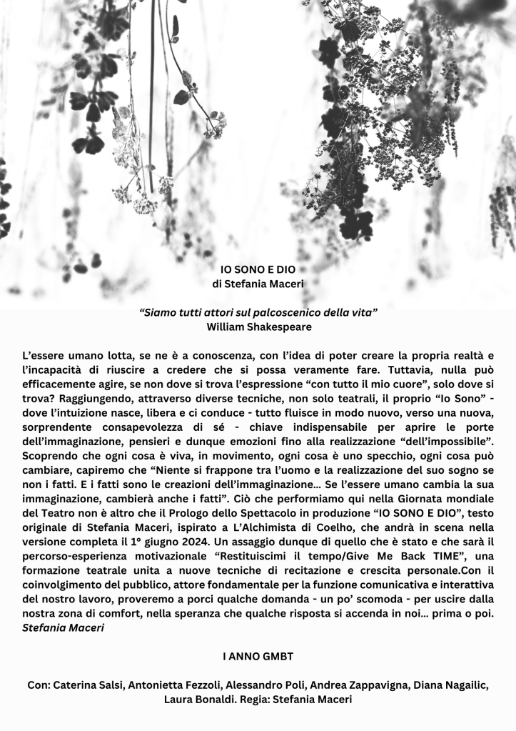 Da “Io Sono e Dio” di Stefania Maceri, un testo che esplora la lotta umana con la creazione della propria realtà e la difficoltà di credere nella possibilità di farlo, il prologo dello spettacolo. Il testo invita il pubblico a riflettere sulle proprie convinzioni e sulla capacità di cambiare la realtà attraverso l’immaginazione.
