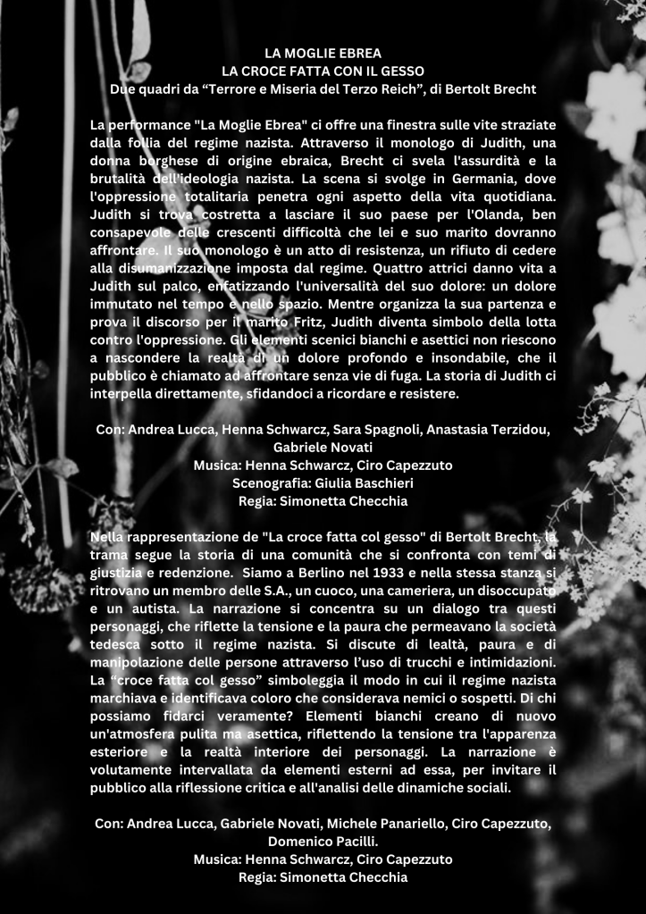 Nel quadro “La Moglie Ebrea”, il monologo di Judith, una donna ebrea, riflette l’assurdità e la brutalità del nazismo. Costretta a fuggire in Olanda, il suo discorso diventa un simbolo di resistenza contro la disumanizzazione. La scena, interpretata da quattro attrici, sottolinea l’universalità del suo dolore e invita il pubblico a confrontarsi con la realtà del regime senza vie di fuga, ricordando e resistendo all’oppressione.