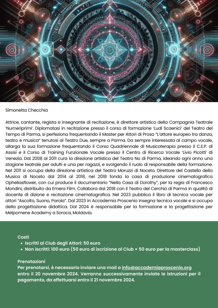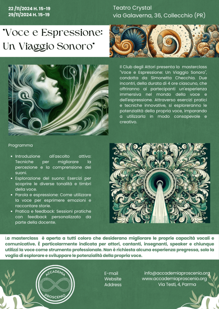 Il Club degli attori presenta: “Voce e Espressione: Un Viaggio Sonoro”, 22 e 29 novembre 2024 15 novembre 20244 dicembre 2024 / accademiaproscenio Scopri di più da Accademia proscenio Abbonati per ricevere gli ultimi articoli inviati alla tua e-mail. Digita la tua e-mail... Iscriviti Condividi: Fai clic per inviare un link a un amico via e-mail (Si apre in una nuova finestra) E-mail Mi piace Caricamento... Correlati