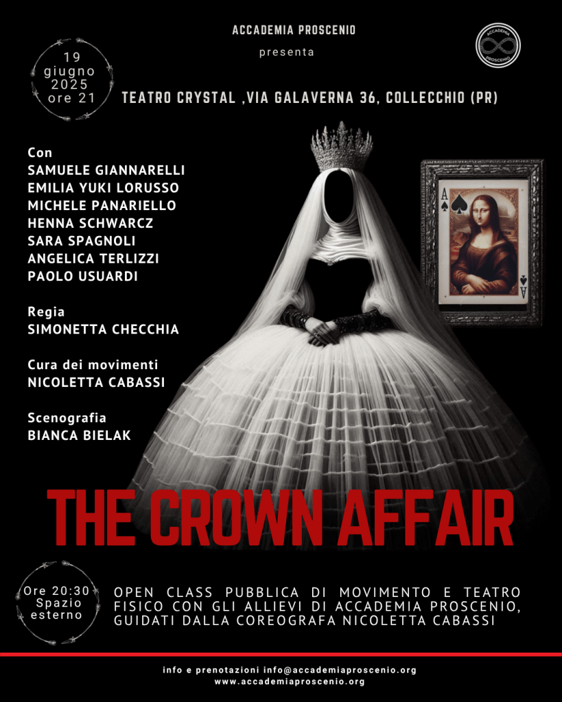 The Crown Affair è una raffinata reinterpretazione della celebre commedia Le Regine di Francia di Thornton Wilder, qui riproposta dalla regista Simonetta Checchia in una nuova versione arricchita da una scena inedita. Lo spettacolo esplora con ironia e profondità il sottile confine tra sogno e realtà, tra legittima aspirazione e pericolosa illusione.